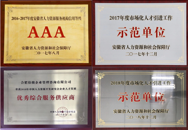 合肥伯駿企業(yè)管理咨詢有限公司前身為合肥企業(yè)經(jīng)營者人才公司,成立于 1999 年 3 月,專注于為黨政機(jī)關(guān)與企事業(yè)單位提供中高級(jí)人才的培育、選拔、評價(jià)、獵頭及管理咨詢服務(wù)。伯駿獵頭是安徽最早的獵頭公司,擁有資深的獵頭團(tuán)隊(duì),有長三角十佳獵手、中國獵頭業(yè)(十位)專家級(jí)顧問、多名參與暢銷書《獵術(shù)》編寫的顧問,獵頭顧問閱歷豐富,對人才和客戶能提供有參考價(jià)值的建議與意見。擁有數(shù)千家優(yōu)質(zhì)客戶和數(shù)千萬的中高級(jí)人才信息,利用信息化手段快速助力獵頭業(yè)務(wù),以專注、專業(yè)的工匠精神,讓單位和人才更優(yōu)秀。2009年被授予“中國獵頭業(yè)十家最具專業(yè)影響力品牌”,2011年被授予“中國尋訪行業(yè)二十佳單位”,2013年被授予“最具滿意度的獵頭服務(wù)機(jī)構(gòu)”,2014年被媒體和企業(yè)譽(yù)為 “安徽第一獵頭”、“合肥城市獵頭”,2018年“中國人力資源開發(fā)研究會(huì)企業(yè)人才發(fā)展優(yōu)秀綜合服務(wù)供應(yīng)商”,2018年度“市場化人才引進(jìn)工作示范單位”。2017 年被安徽省人社廳評選為“AAA”誠信信用等級(jí)人力資源服務(wù)機(jī)構(gòu),2017 年和 2018 年連續(xù)兩年被安徽省人社廳評為“市場化人才引進(jìn)工作示范單位”,2018 年被中國人力資源開發(fā)研究會(huì)評為“優(yōu)秀綜合服務(wù)供應(yīng)商”。