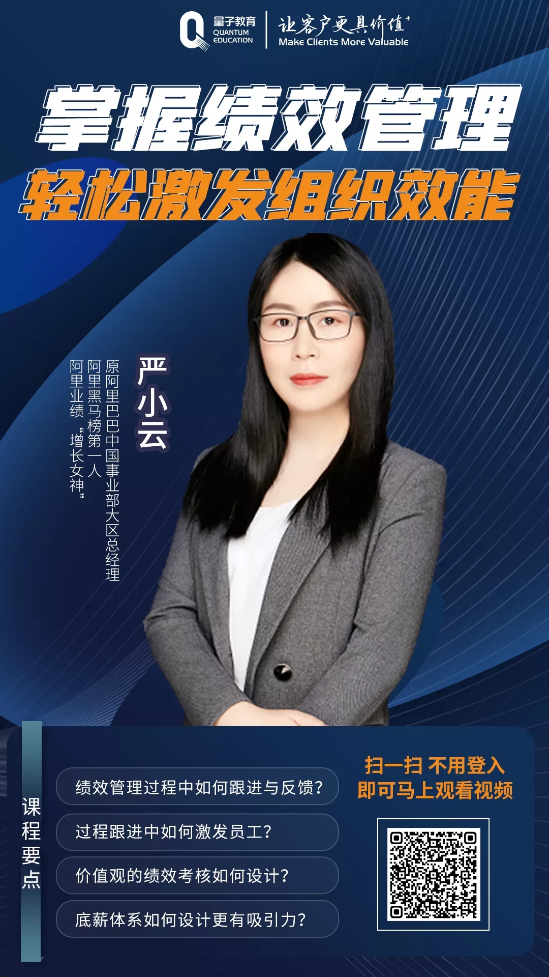原阿里巴巴中國區(qū)事業(yè)部總經(jīng)理、阿里“增長(zhǎng)女神”嚴(yán)小云老師聯(lián)合量子教育推出了全新精品好課《掌握績(jī)效管理,輕松激發(fā)組織效能》。