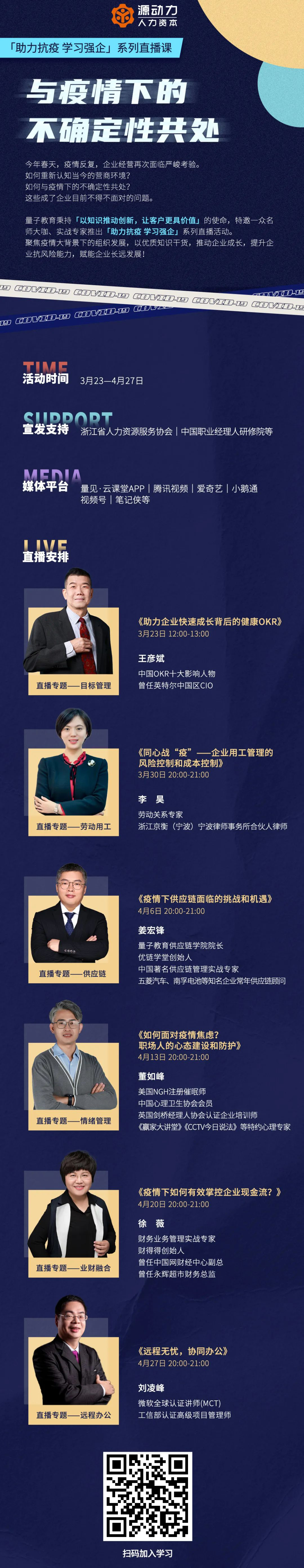 量子教育攜手一眾名師大咖、實(shí)戰(zhàn)專家聚焦疫情大背景下的組織發(fā)展,推出「助力抗疫 學(xué)習(xí)強(qiáng)企」系列直播活動,通過企業(yè)目標(biāo)管理、情緒管理、勞動用工、業(yè)財(cái)融合、遠(yuǎn)程辦工、供應(yīng)鏈等多個維度提升企業(yè)抗風(fēng)險(xiǎn)能力,賦能企業(yè)長遠(yuǎn)發(fā)展!