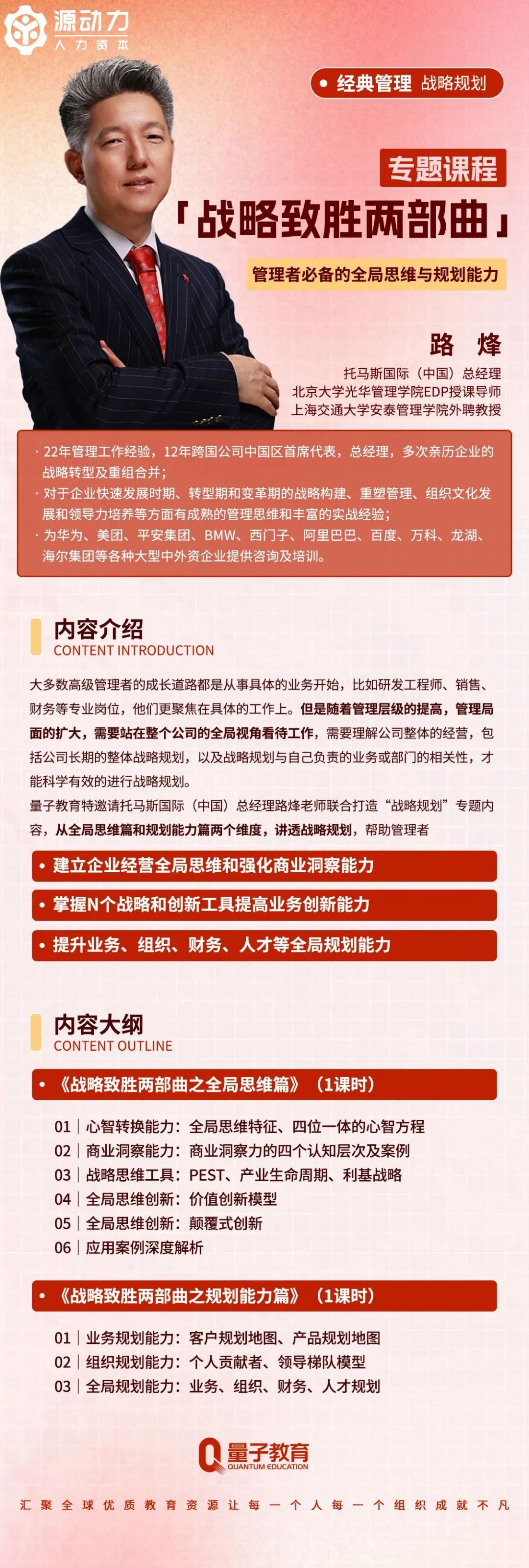 聚焦管理者戰(zhàn)略規(guī)劃痛點,路烽老師《戰(zhàn)略致勝兩部曲》專題課程,從全局思維篇和規(guī)劃能力篇兩個維度,講透戰(zhàn)略規(guī)劃,幫助管理者: